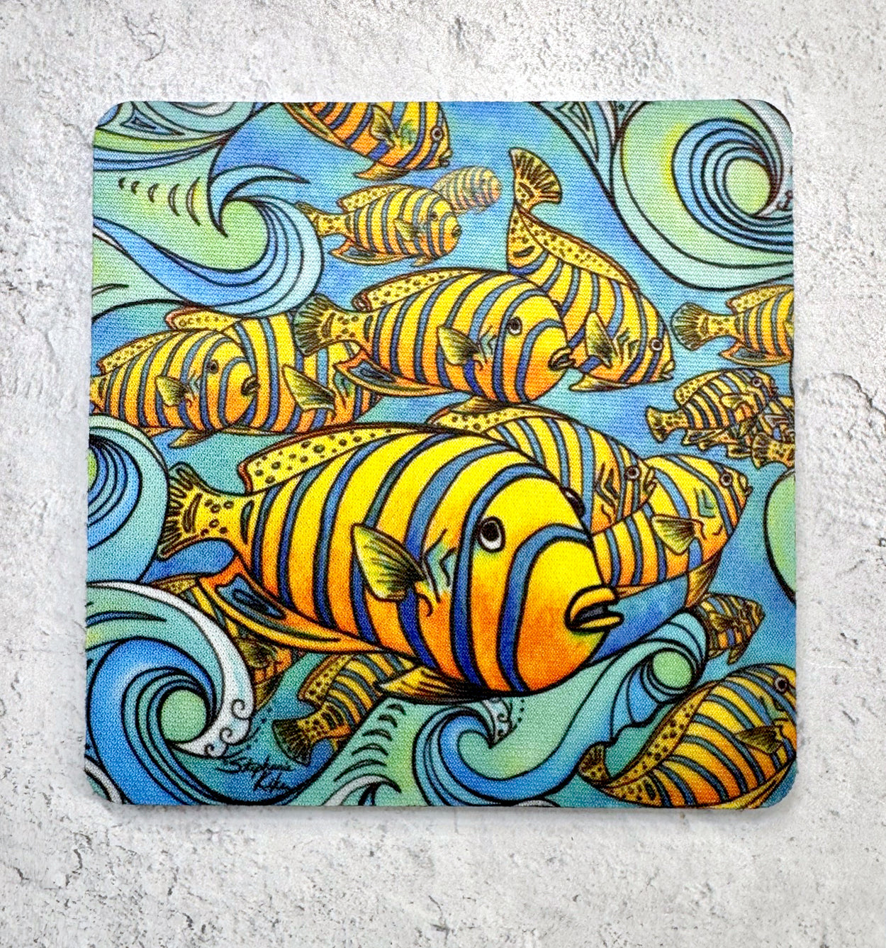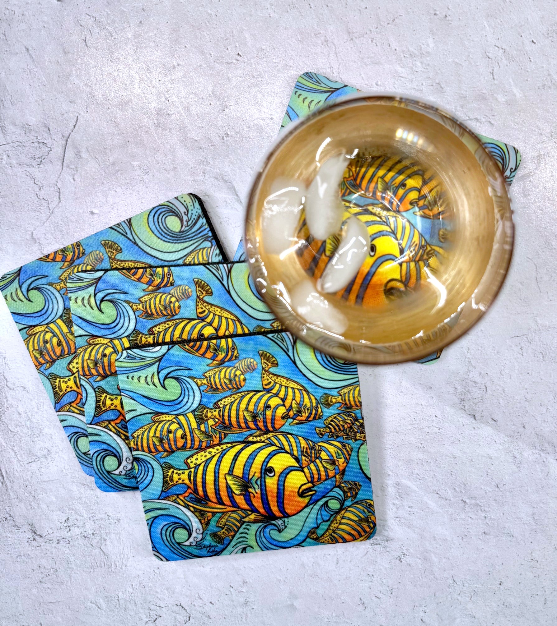 4" x 4" x 3/16" Thick. Polyester top with neoprene rubber backing. Flexible, slip-resistant and durable, rubber coasters are also washable. Coasters are sold in packages of 4 per design or as individual so you can mix and match your own set! These make great gift items.