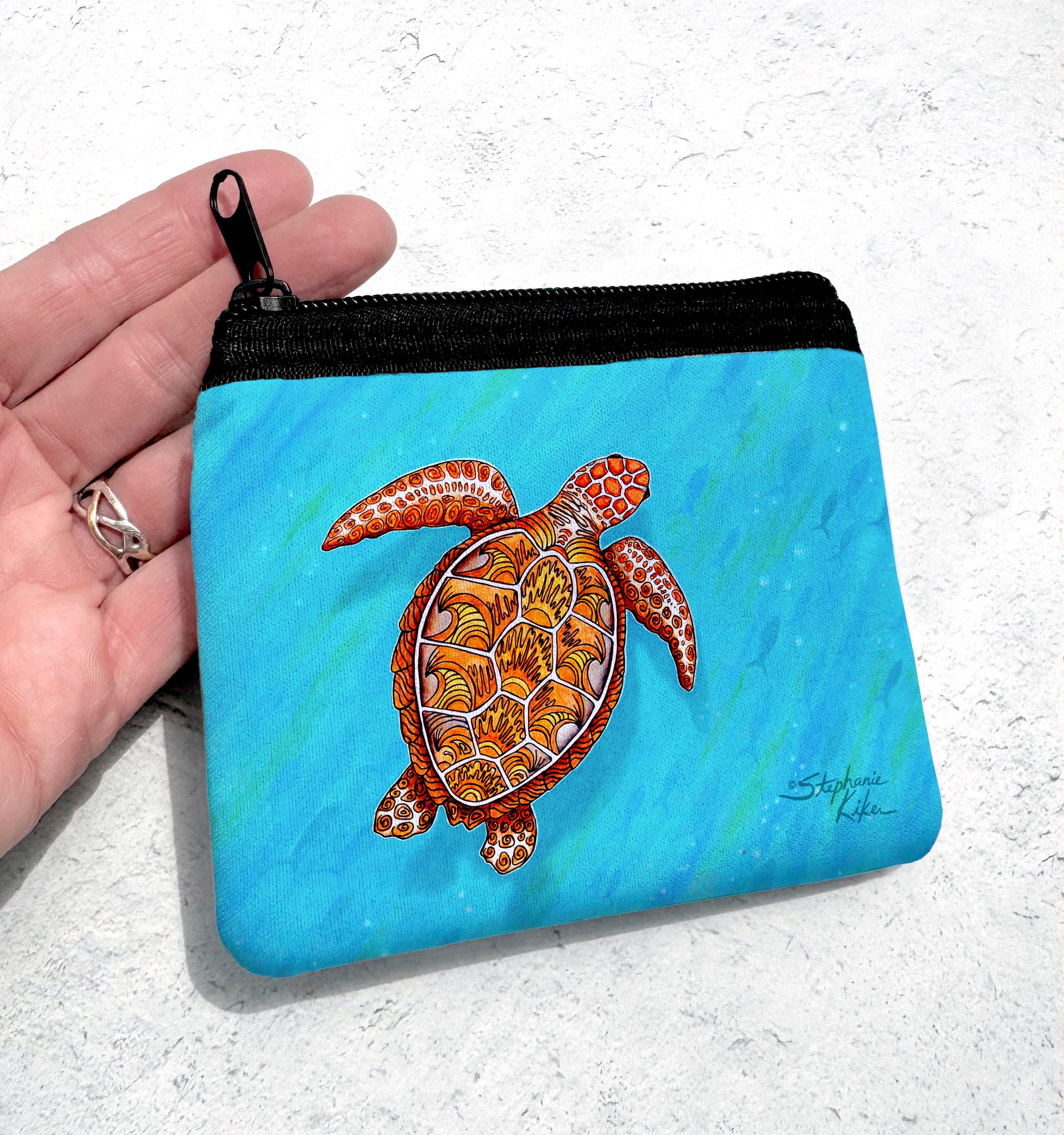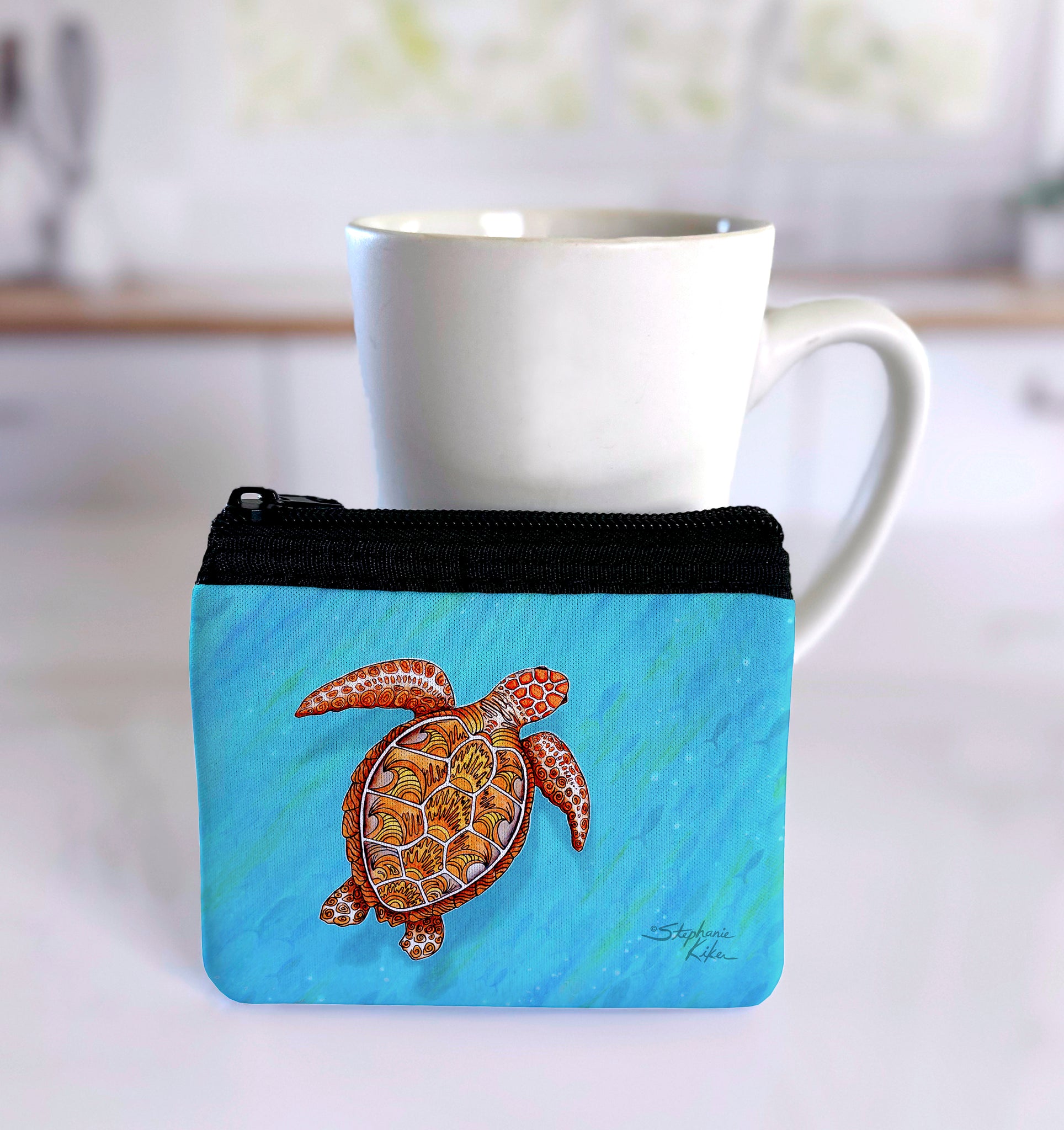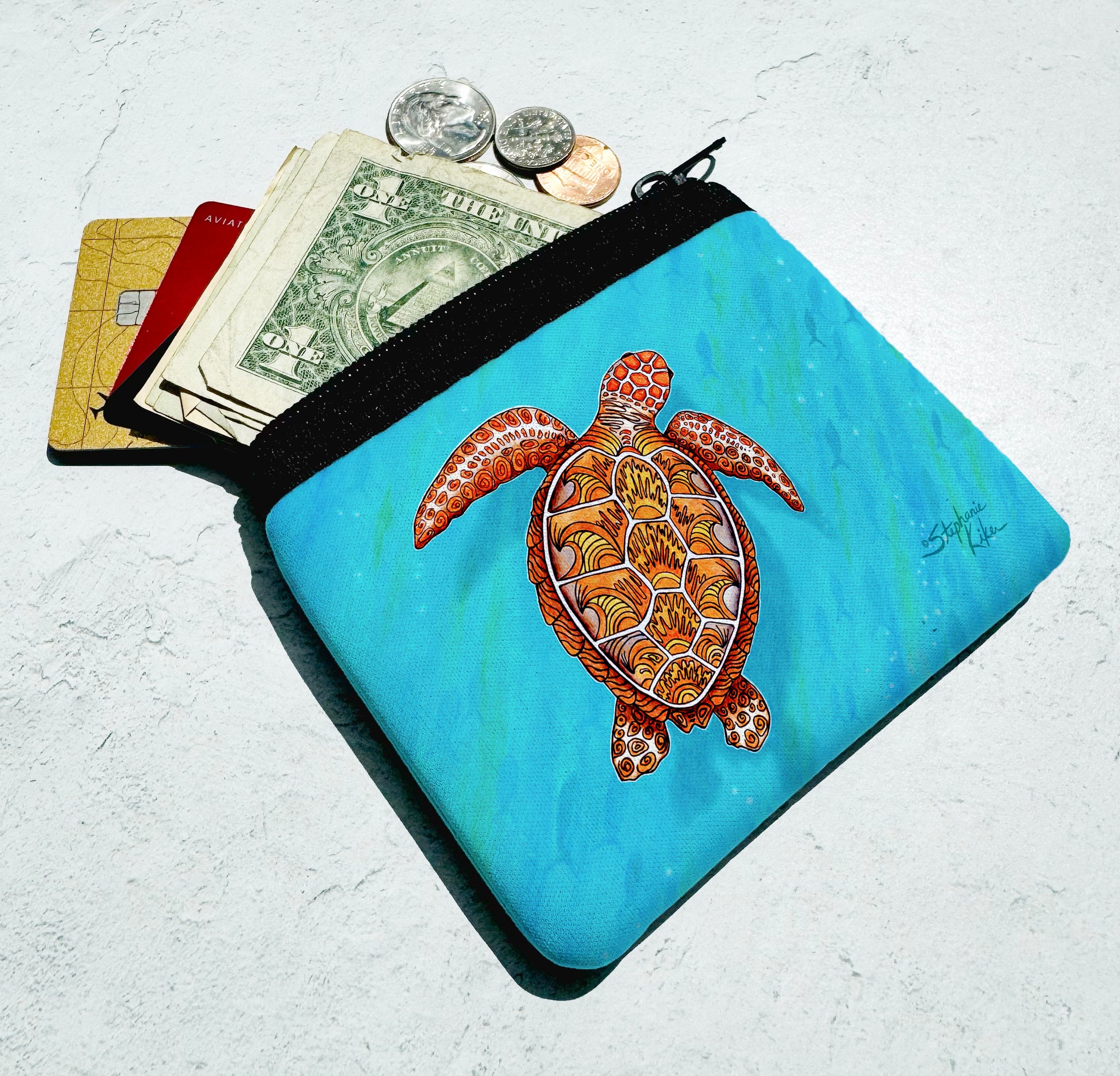 Great gift item! Multiple uses...loose bills and change, credit cards and id's. Size is 5" x 4" and made of polyester fabric over high density open-cell scuba foam with zipper. Artwork is on both sides of the case.