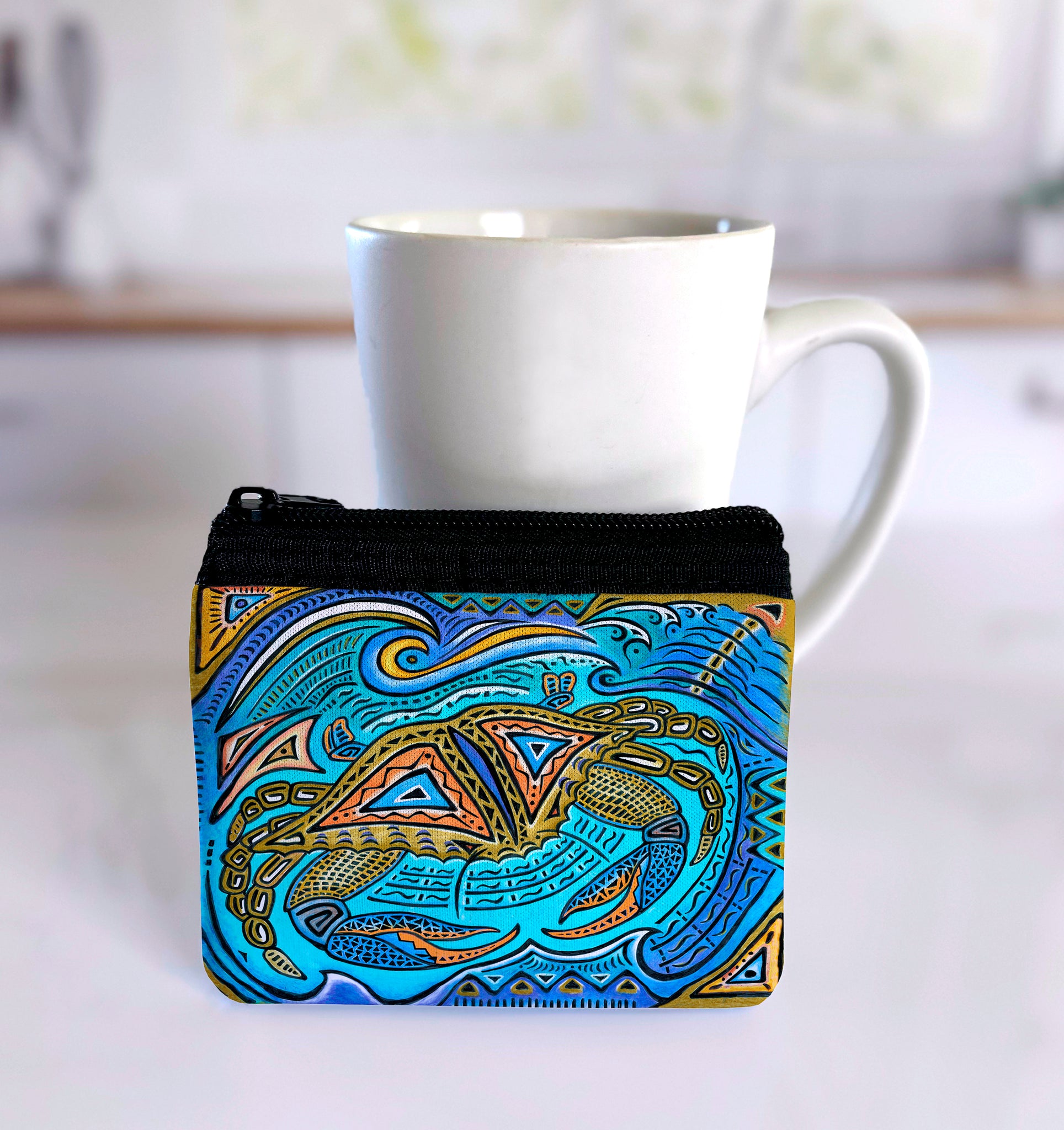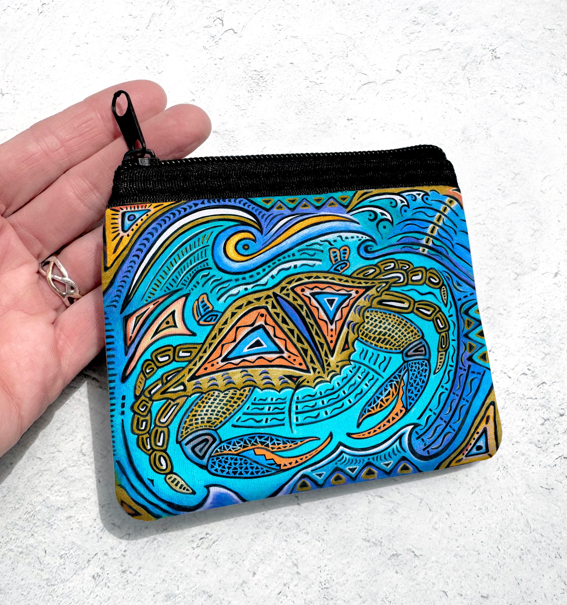 Great gift item! Multiple uses...loose bills and change, credit cards and id's. Size is 5" x 4" and made of polyester fabric over high density open-cell scuba foam with zipper. Artwork is on both sides of the case.