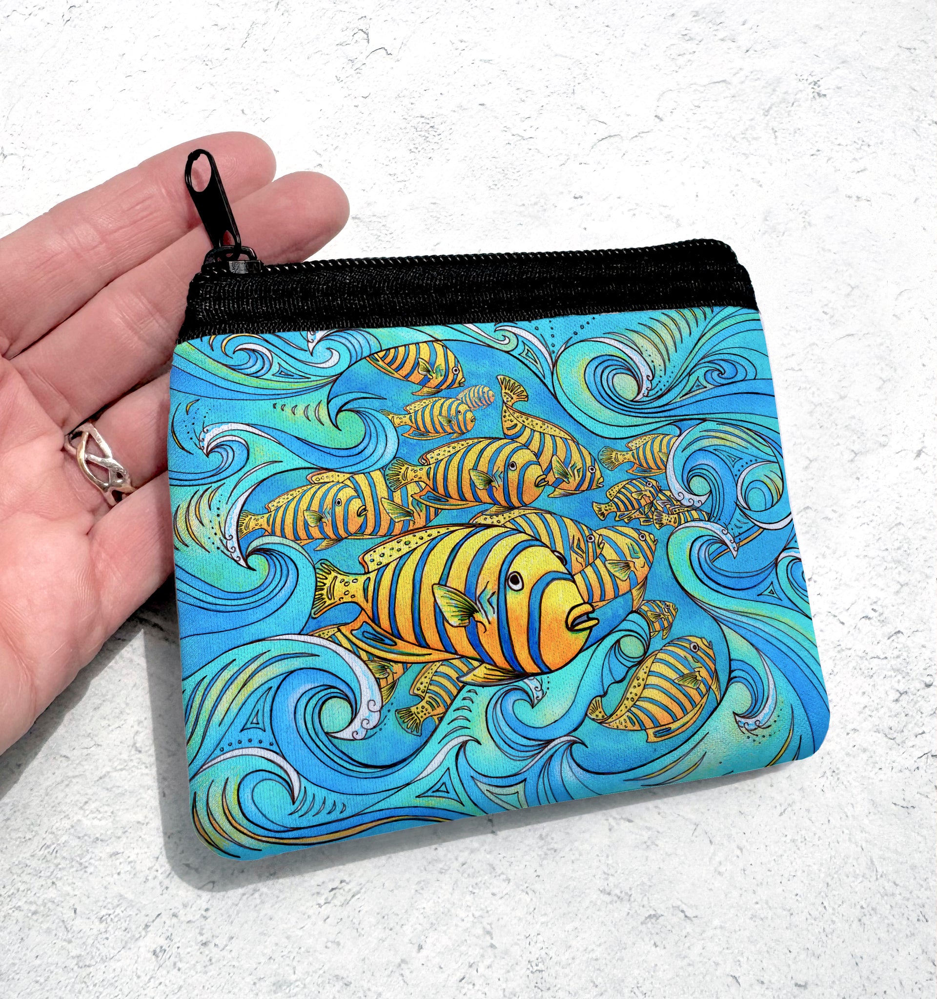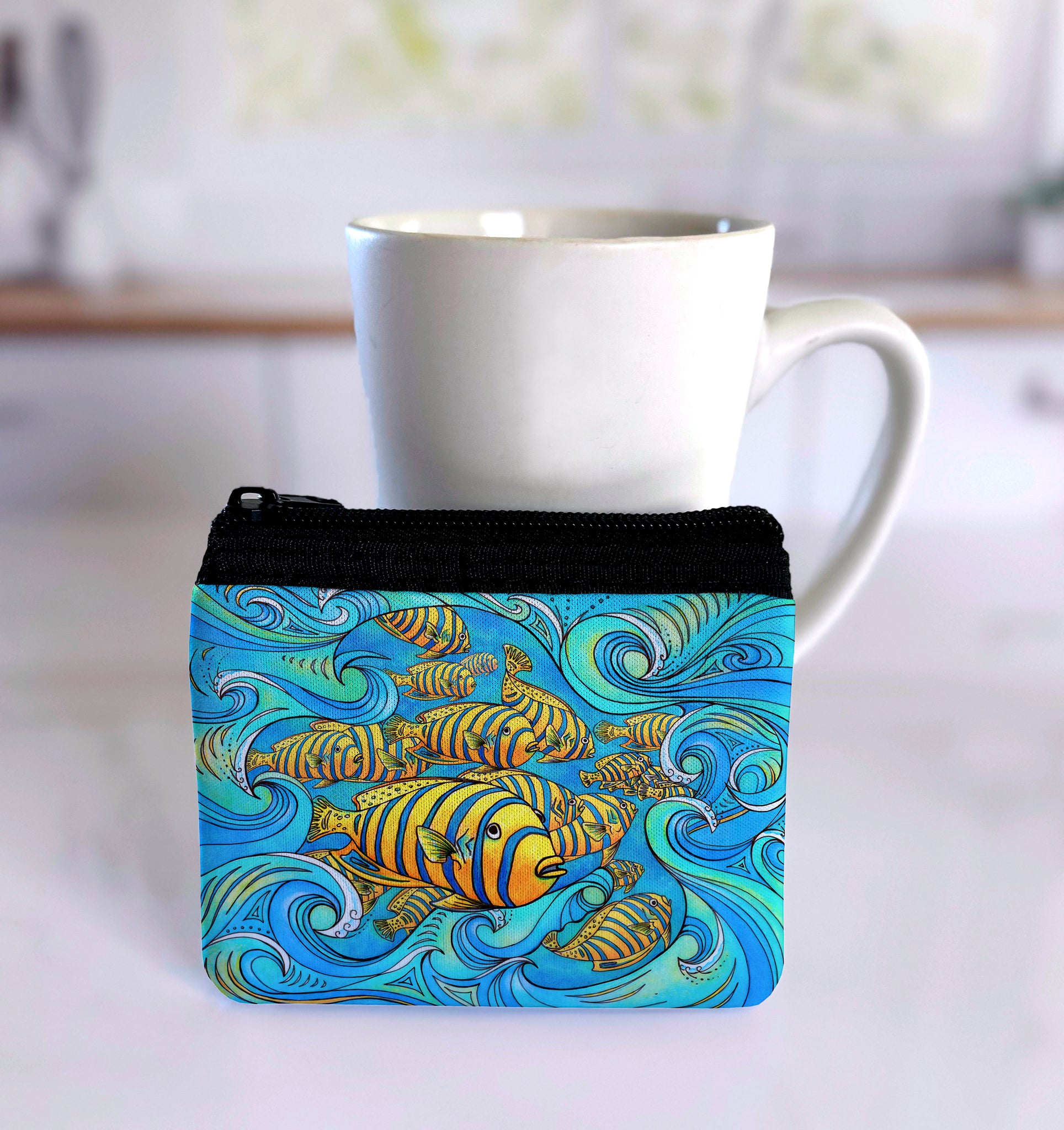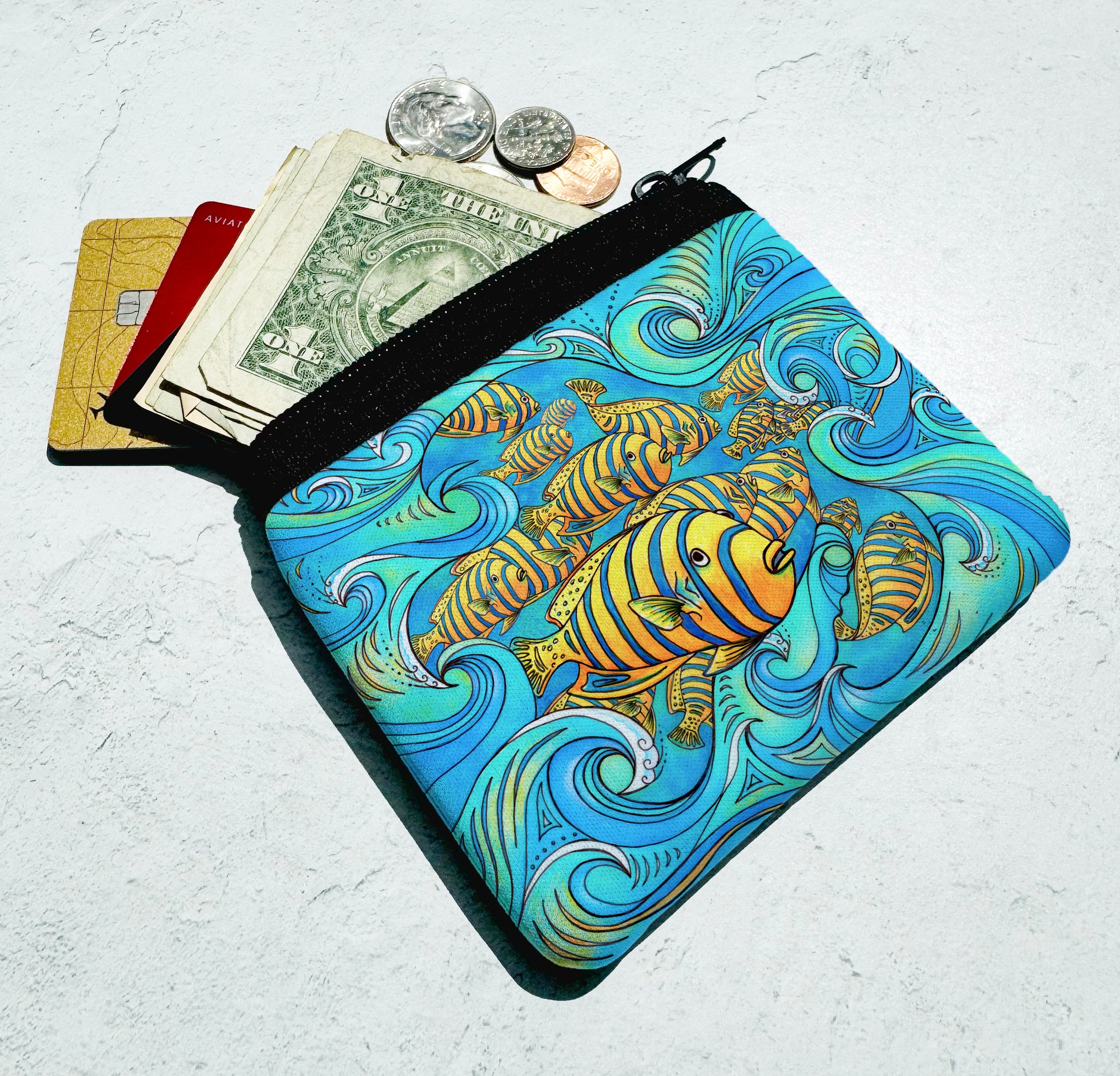 Great gift item! Multiple uses...loose bills and change, credit cards and id's. Size is 5" x 4" and made of polyester fabric over high density open-cell scuba foam with zipper. Artwork is on both sides of the case.