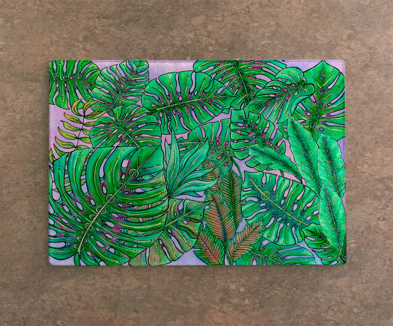 Made with tempered Glass, they can be used as Cutting Board, Hot Plate, Trivet or Cheese Board. Available in two sizes: 8” x 11” and 11” x 15.375”. Use for all of your everyday and gourmet cooking & serving needs. As a cutting surface, tempered glass resists stains, odors & bacteria and rubber feet prevent slipping on the counter-top. These boards make unique serving platters for hors d'oeuvres. Store in upright position to show off the board’s beauty. Artistic addition to any kitchen or wet bar area. Hand wash in warm water.
