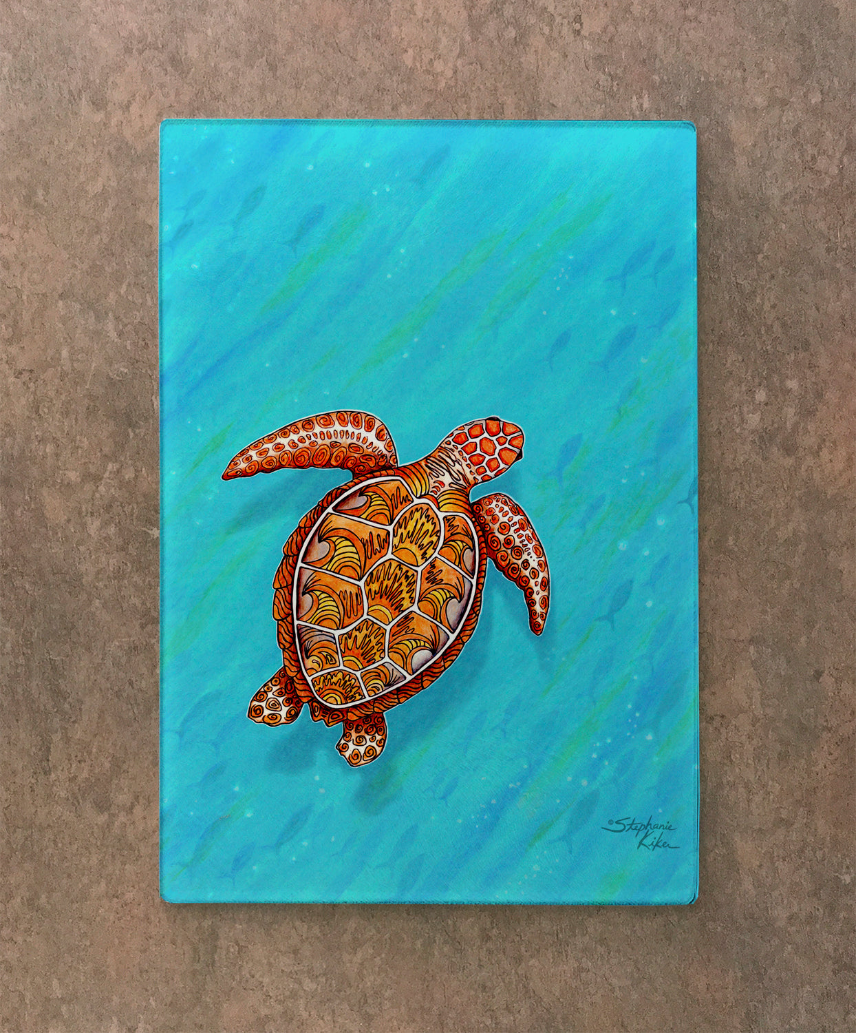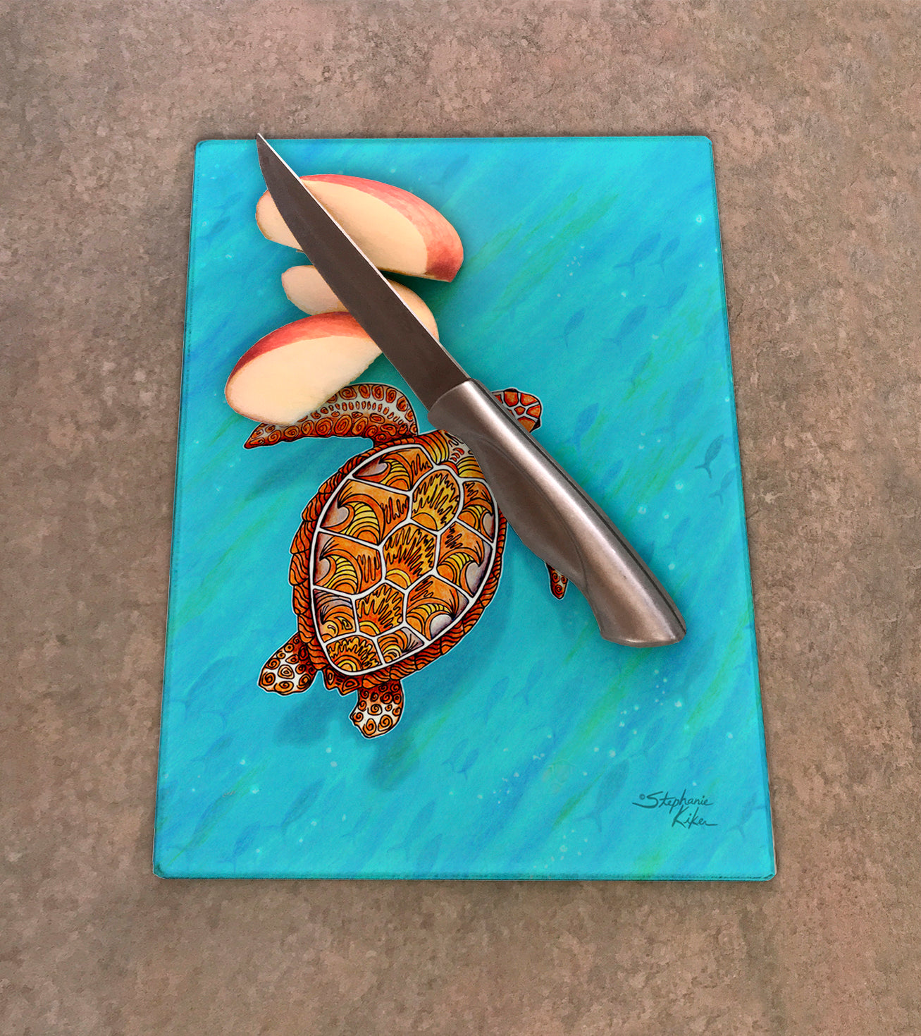Made with tempered Glass, they can be used as Cutting Board, Hot Plate, Trivet or Cheese Board. Available in two sizes: 8” x 11” and 11” x 15.375”. Use for all of your everyday and gourmet cooking & serving needs. As a cutting surface, tempered glass resists stains, odors & bacteria and rubber feet prevent slipping on the counter-top. These boards make unique serving platters for hors d'oeuvres. Store in upright position to show off the board’s beauty. Artistic addition to any kitchen or wet bar area. Hand wash in warm water.