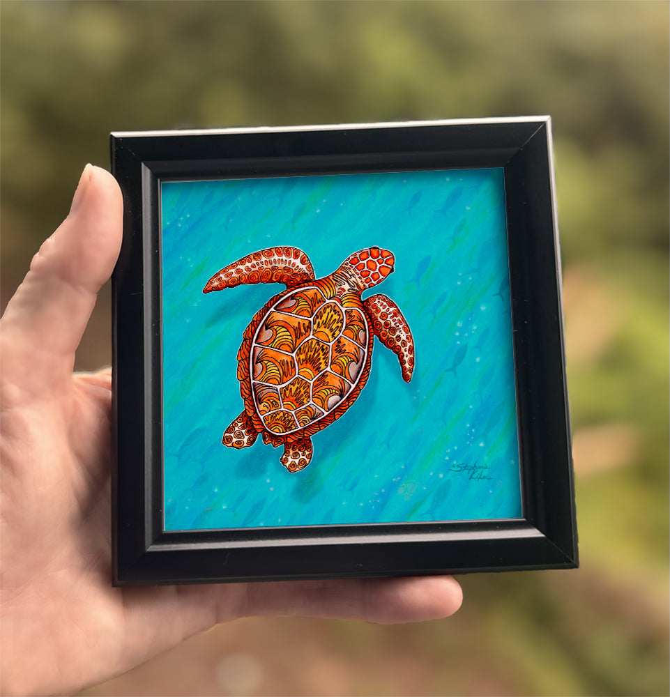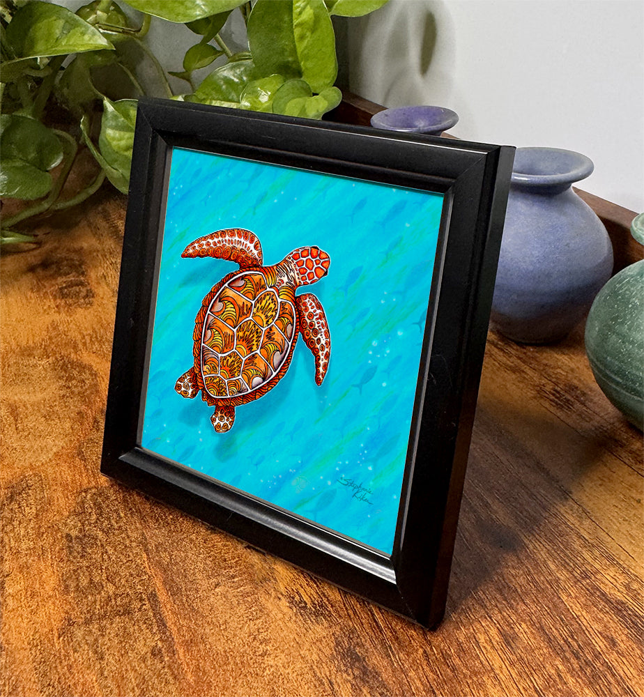 Small in size, big in charm! Each piece features Stephanie's vibrant colored pencil art — from sea turtles and lighthouses to coastal scenes — beautifully set in a sleek black frame. Perfect as a thoughtful gift, a desk accent, or a pop of color on a shelf, these mini artworks bring a touch of the coast into any space. Artwork is printed on special 4" x 4" MDF wood pieces with a gloss finish and framed. Frames have easels and hooks on the back for hanging too.