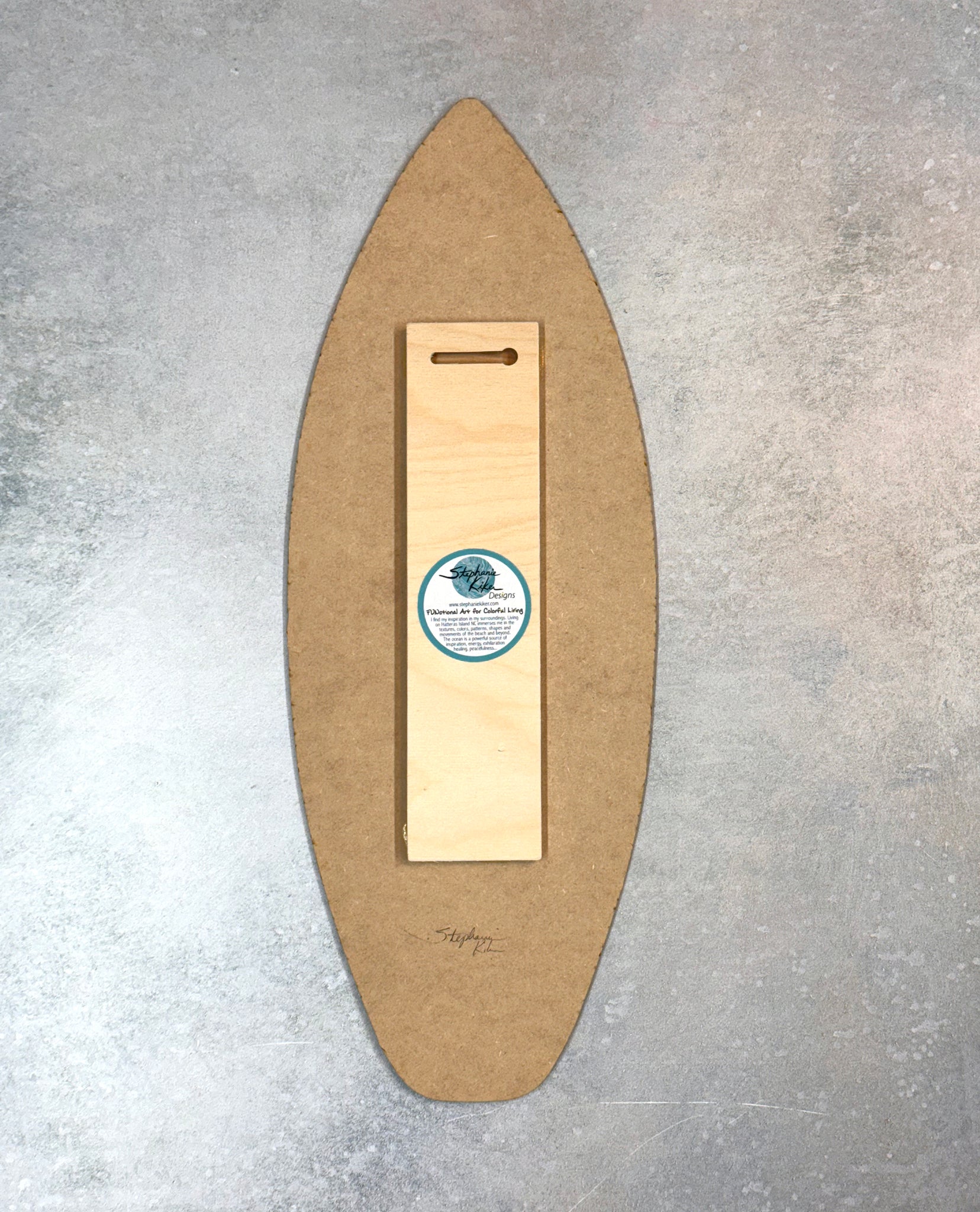 These mini surf boards make a fun addition to any decor! They are 1/8 inch thick mdf board with a gloss finish that shows off the bright artwork. A wood piece on the back gives them a floating "off the wall" appearance. Indoor use only. 2 sizes available.
