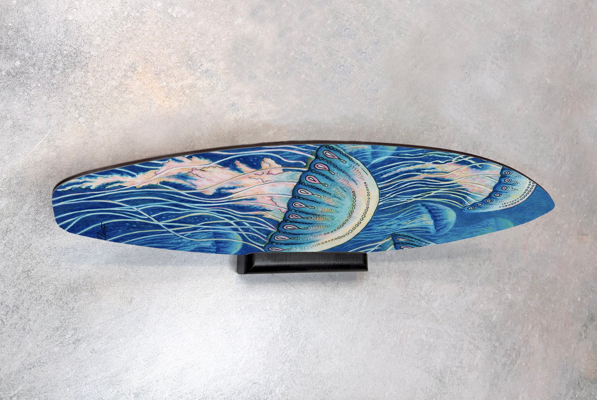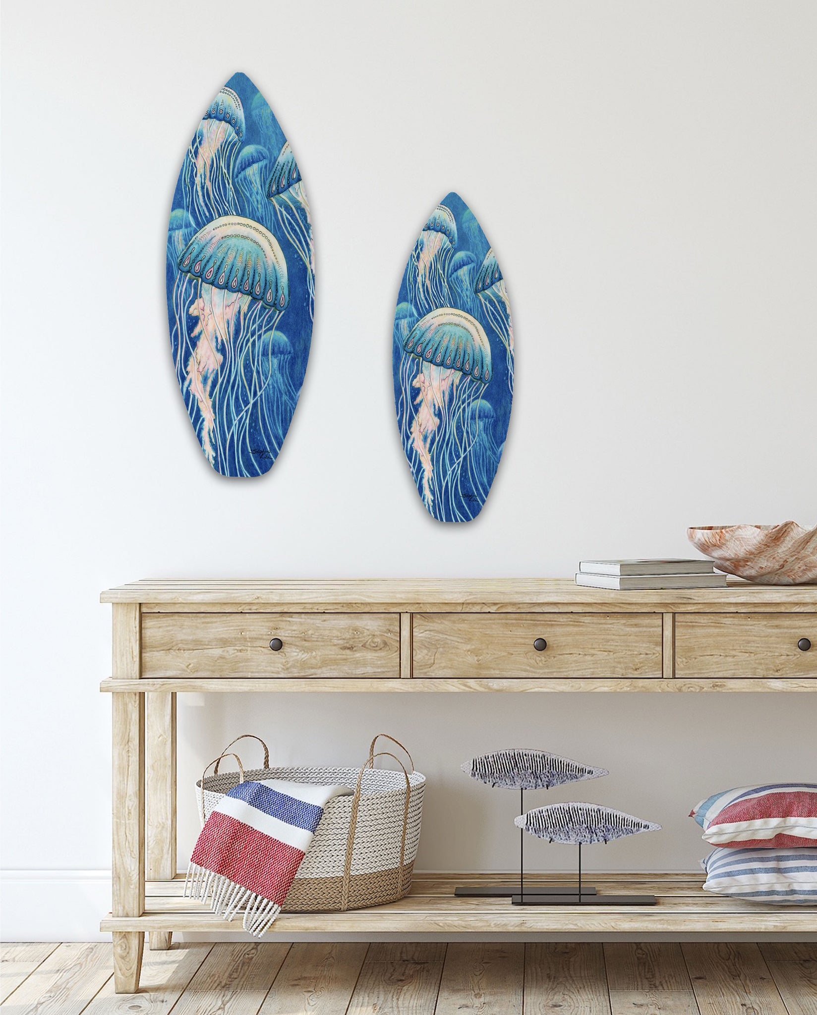 These mini surf boards make a fun addition to any decor! They are 1/8 inch thick mdf board with a gloss finish that shows off the bright artwork. A wood piece on the back gives them a floating "off the wall" appearance. Indoor use only. 2 sizes available.