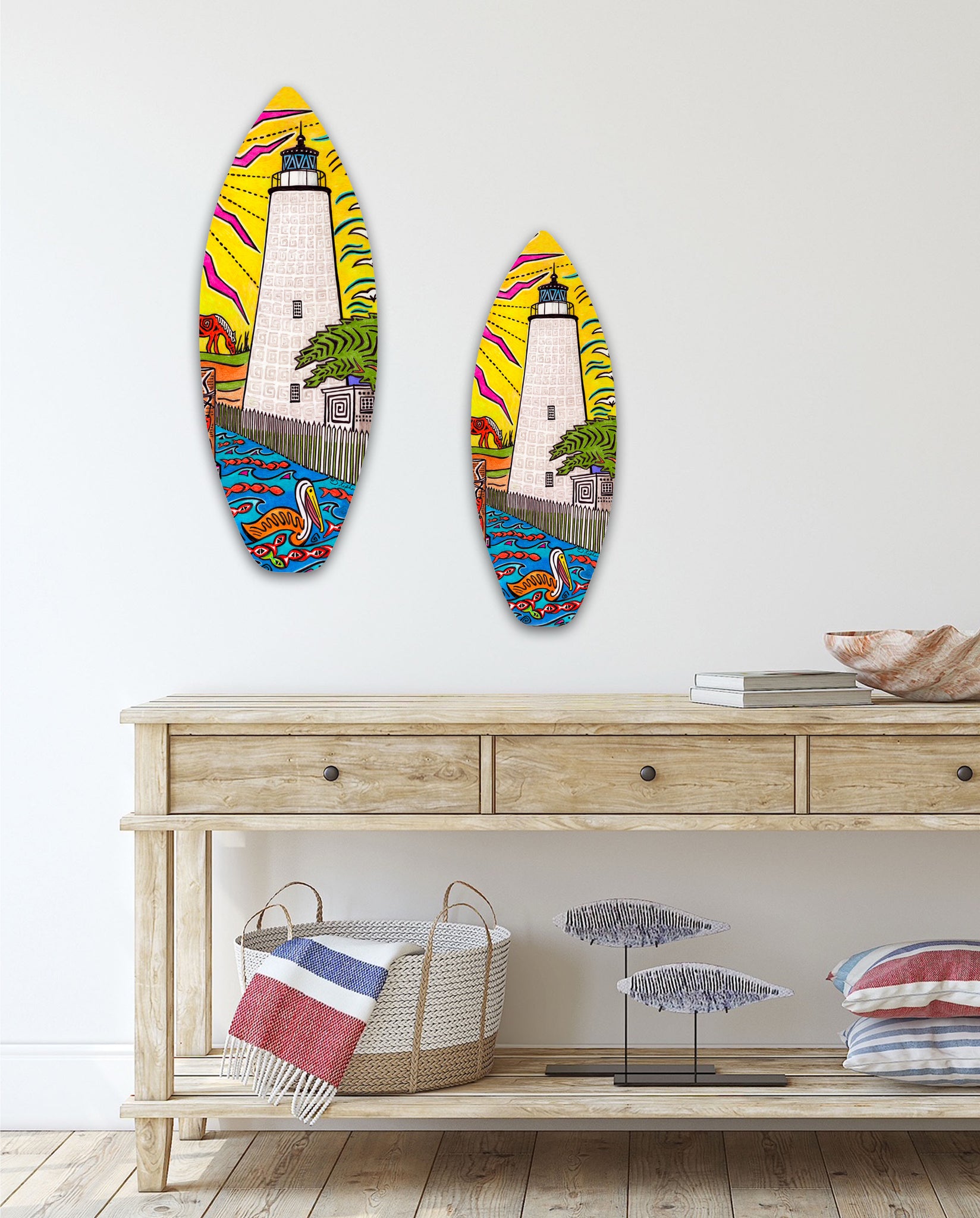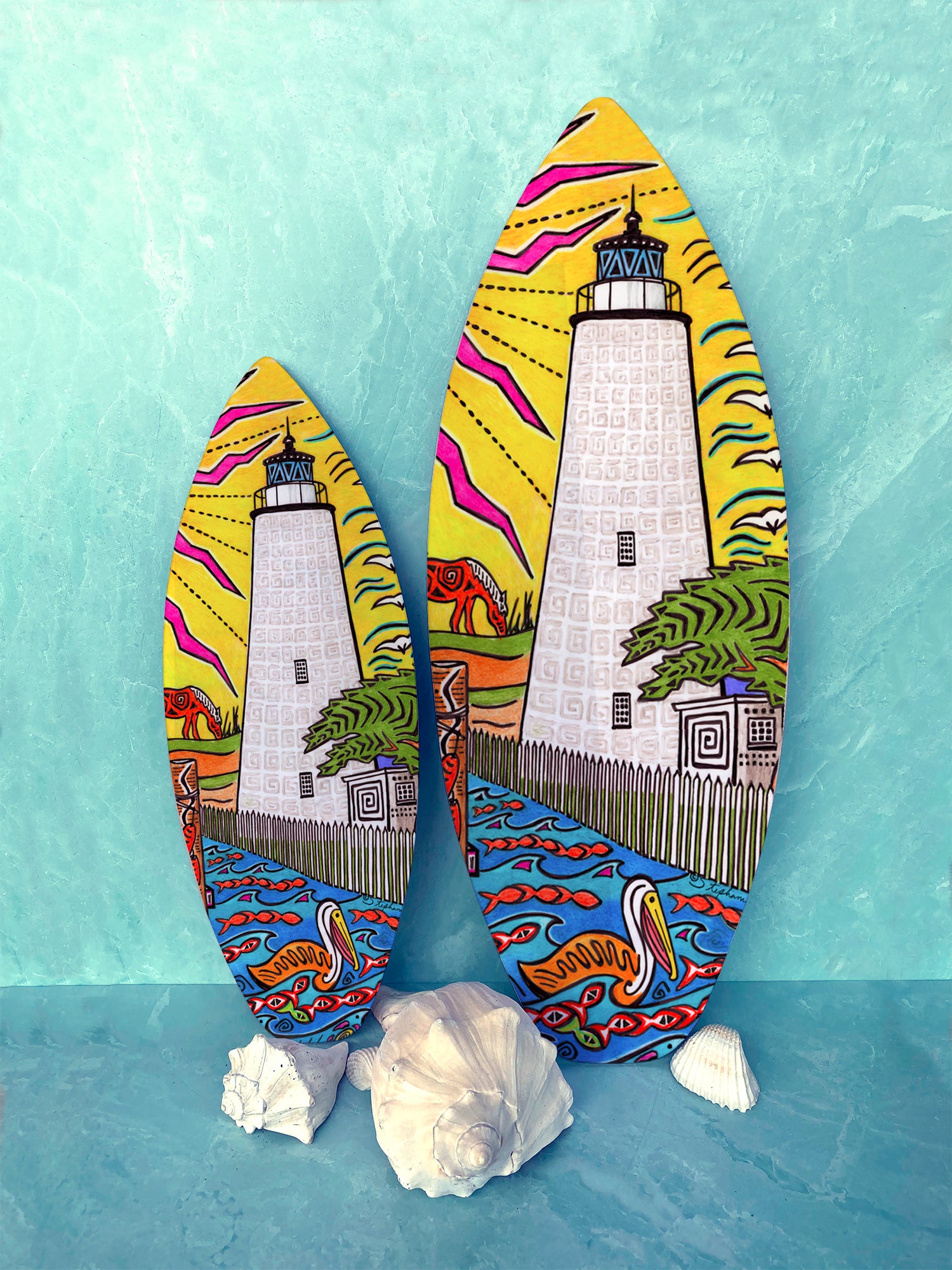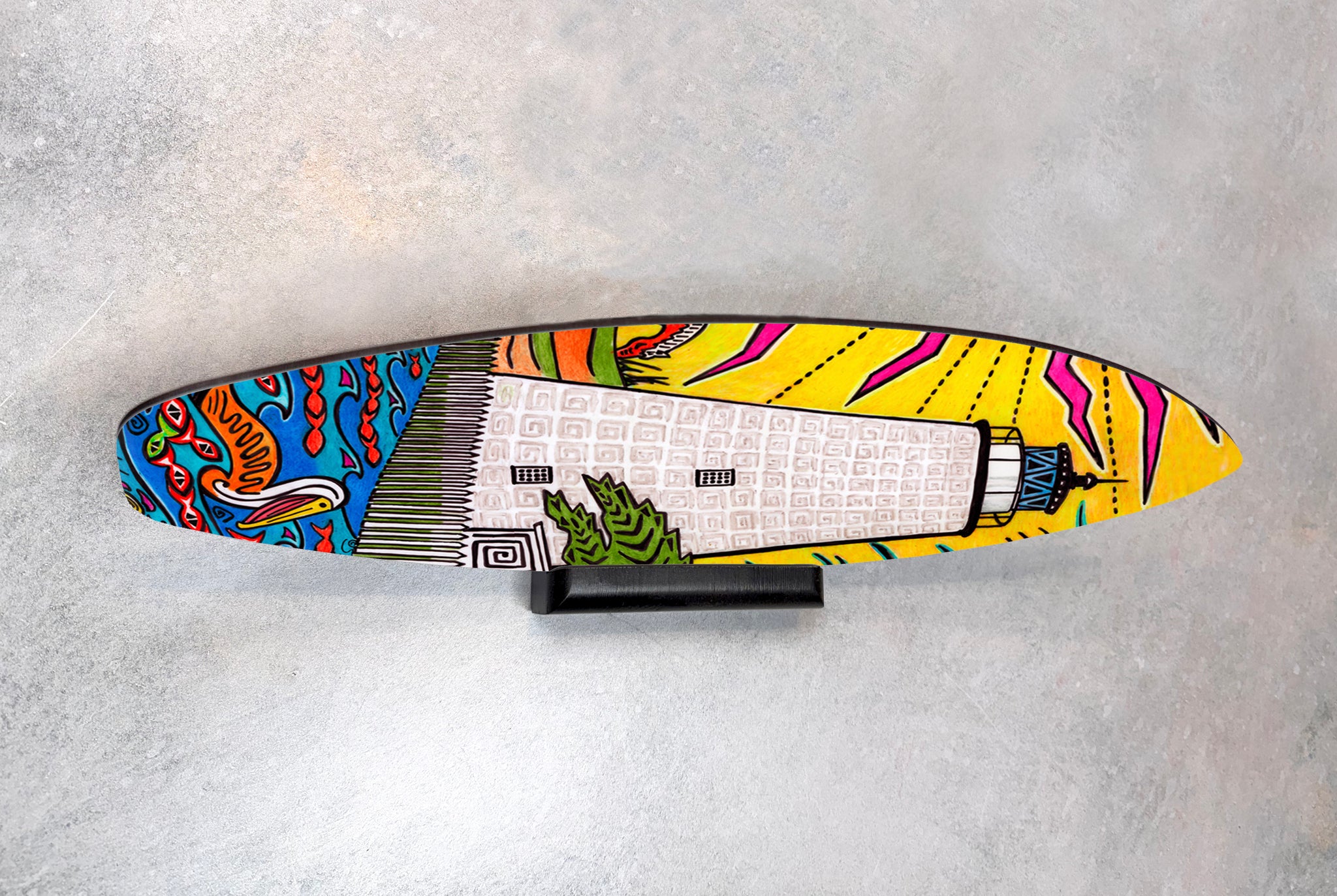 These mini surf boards make a fun addition to any decor! They are 1/8 inch thick mdf board with a gloss finish that shows off the bright artwork. A wood piece on the back gives them a floating "off the wall" appearance. Indoor use only. 2 sizes available.