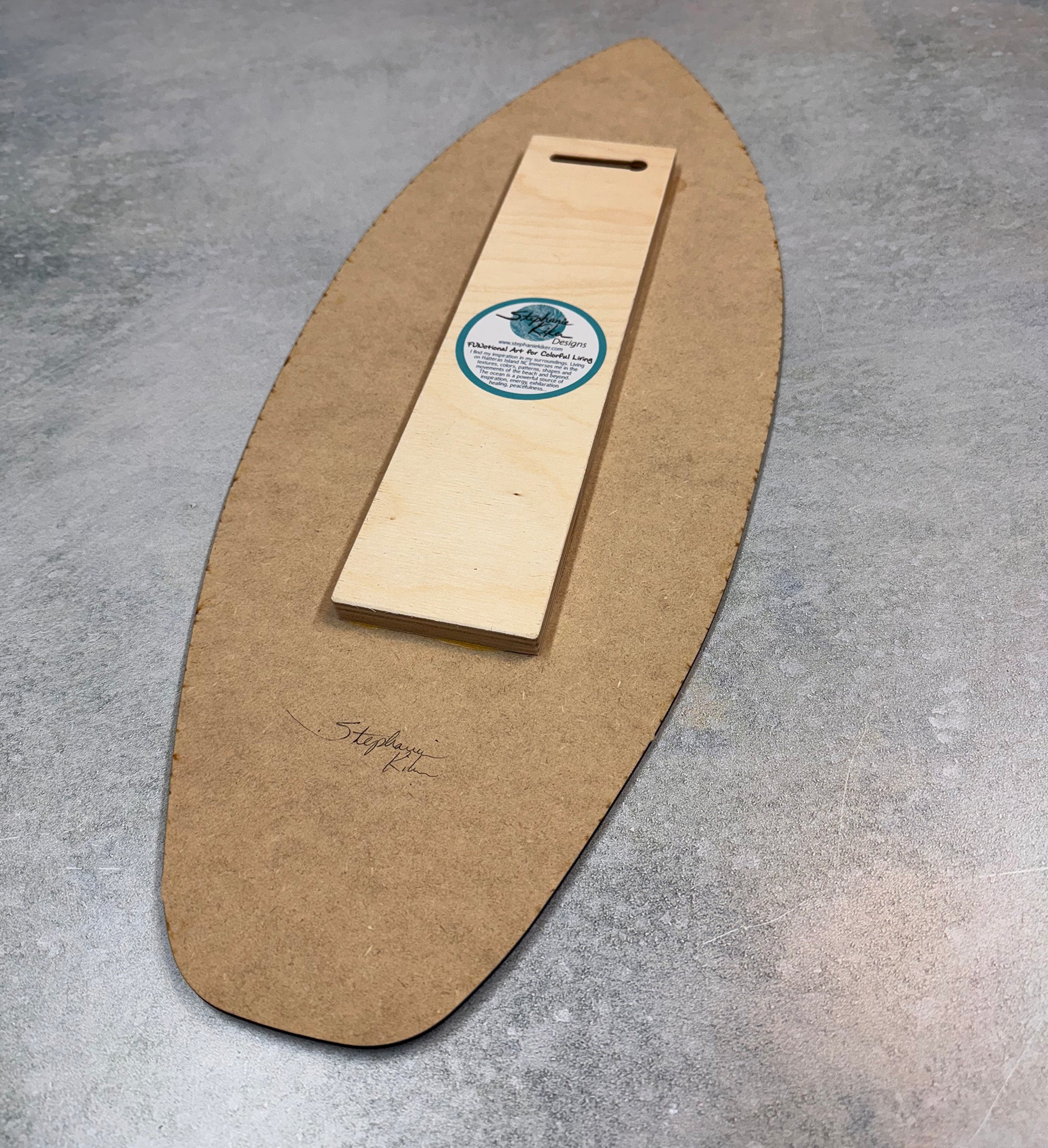 These mini surf boards make a fun addition to any decor! They are 1/8 inch thick mdf board with a gloss finish that shows off the bright artwork. A wood piece on the back gives them a floating "off the wall" appearance. Indoor use only. 2 sizes available.
