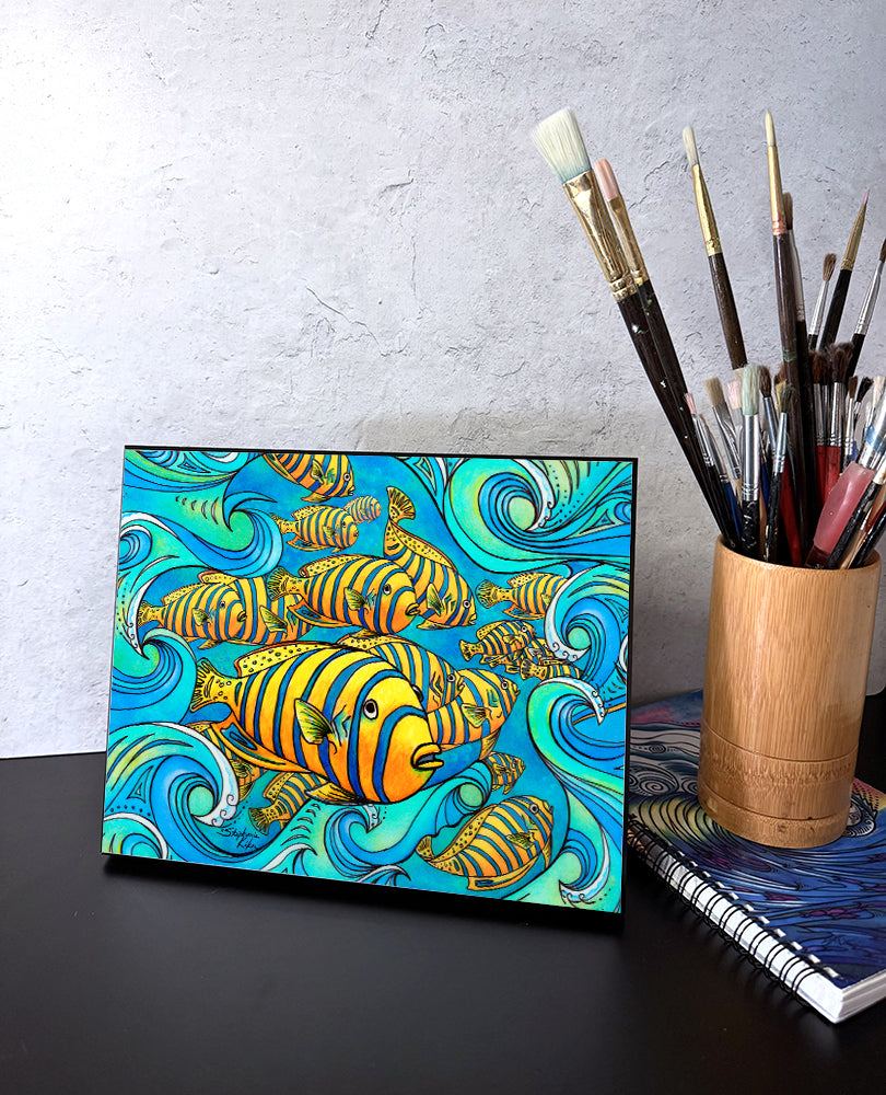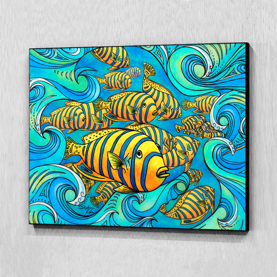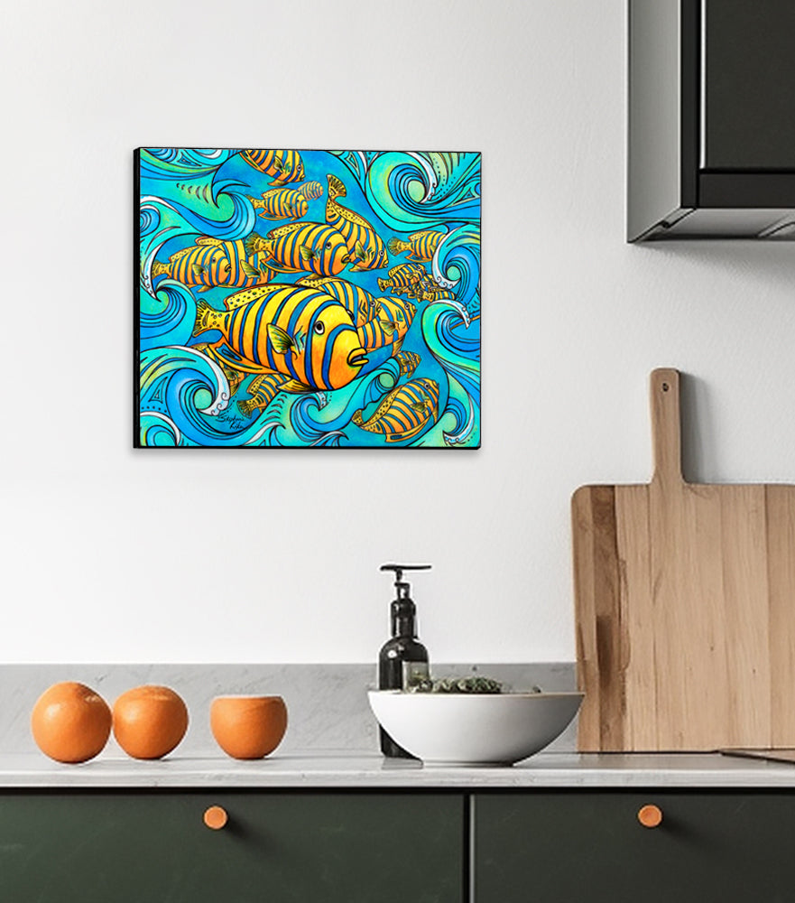 READY-TO-HANG WALL ART - These MDF wood panels have a gloss finish that pops the bright, fun colors of Stephanie's artwork. They are 5/8" thick with a black edge and sit flat against the wall with a mounting keyhole on the back.