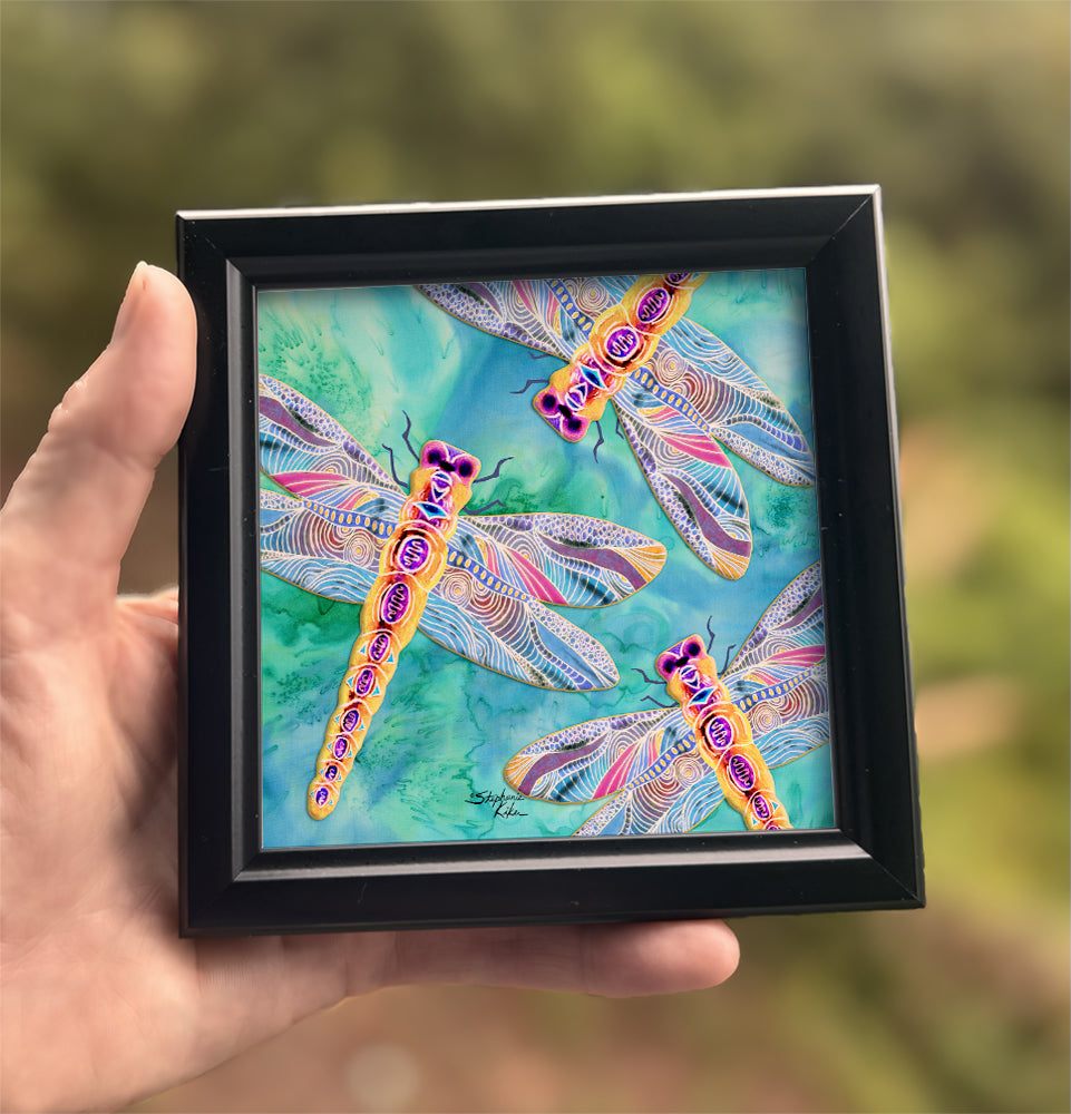 Small in size, big in charm! Each piece features Stephanie's vibrant colored pencil art — from sea turtles and lighthouses to coastal scenes — beautifully set in a sleek black frame. Perfect as a thoughtful gift, a desk accent, or a pop of color on a shelf, these mini artworks bring a touch of the coast into any space. Artwork is printed on special 4" x 4" MDF wood pieces with a gloss finish and framed. Frames have easels and hooks on the back for hanging too.
